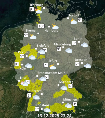 Detaillierte Informationen für Ihren gewünschten Ort erhalten Sie auf unseren Vorhersageseiten mit allen wichtigen Wetterparametern wie z.B. Temperatur, Niederschlagswahrscheinlichkeit, Wetterwarnungen, Luftdruck, Windrichtung, Windstärke und Windgeschwindigkeit.