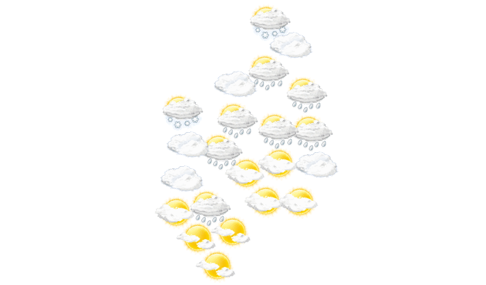 In Mandōl gibt es am Morgen Regen bei Werten von 7°C. Im Laufe des Mittags bleibt die Wolkendecke geschlossen und die Temperatur erreicht 9°C. Am Abend sollte in Mandōl der Schirm nicht vergessen werden, da es regnet bei Temperaturen von 7 bis 8°C. In der Nacht regnet es bei Werten von 7°C.