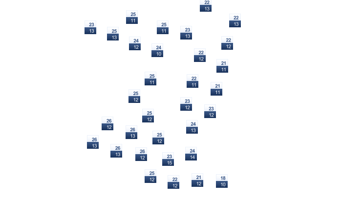 | 16 | 18 | 23 | 28 | 35 | 40 | 39 | 38 | 35 | 31 | 23 | 18 |