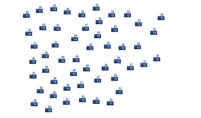 21 | 25 | 28 | 32 | 37 | 43 | 45 | 44 | 40 | 33 | 26 | 21 |