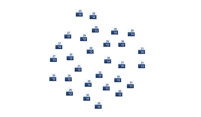| 21 | 25 | 28 | 32 | 37 | 43 | 45 | 44 | 40 | 33 | 26 | 21 |