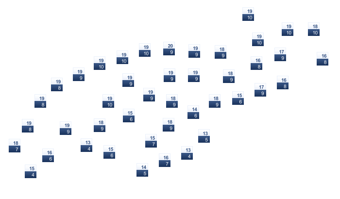 | 21 | 25 | 28 | 32 | 37 | 43 | 45 | 44 | 40 | 33 | 26 | 21 |