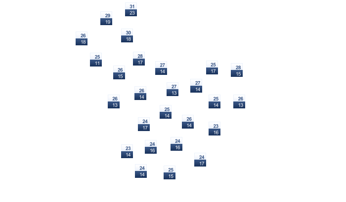 | 21 | 25 | 28 | 32 | 37 | 43 | 45 | 44 | 40 | 33 | 26 | 21 |