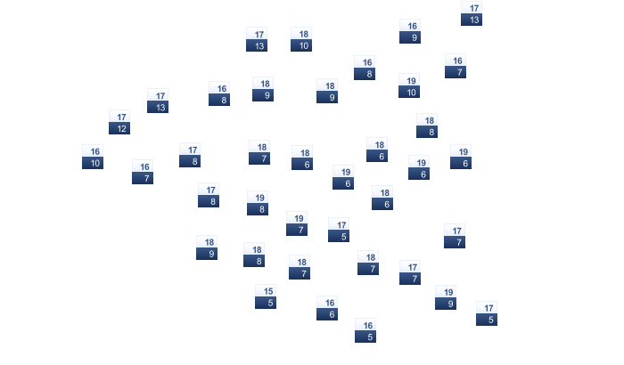 | 21 | 25 | 28 | 32 | 37 | 43 | 45 | 44 | 40 | 33 | 26 | 21 |