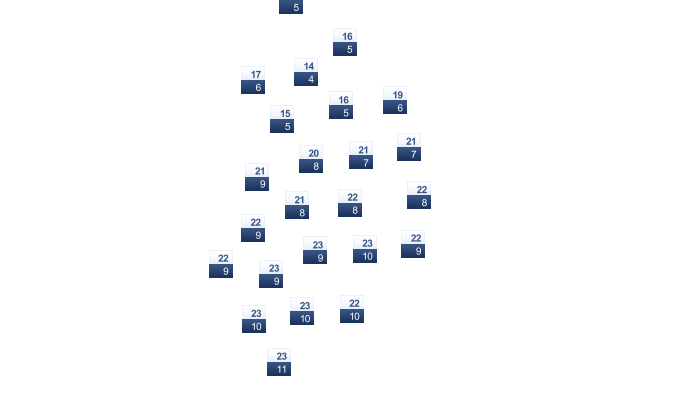 | 21 | 25 | 28 | 32 | 37 | 43 | 45 | 44 | 40 | 33 | 26 | 21 |