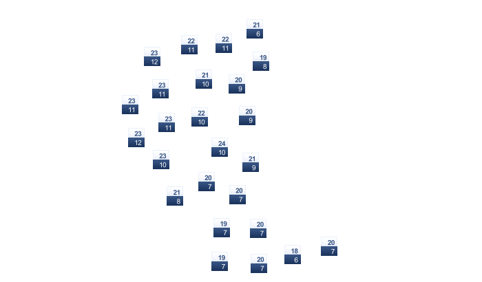 | 21 | 25 | 28 | 32 | 37 | 43 | 45 | 44 | 40 | 33 | 26 | 21 |