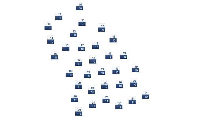 | 21 | 25 | 28 | 32 | 37 | 43 | 45 | 44 | 40 | 33 | 26 | 21 |