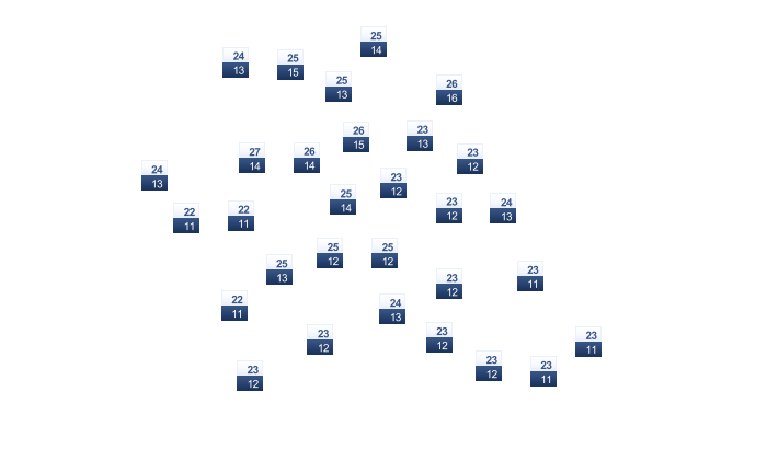 | 21 | 25 | 28 | 32 | 37 | 43 | 45 | 44 | 40 | 33 | 26 | 21 |