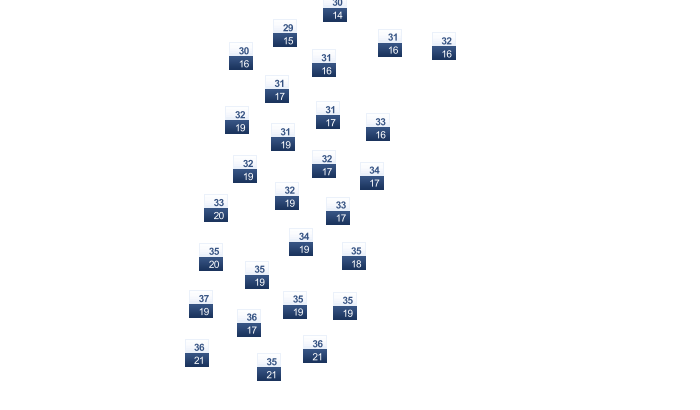 | 21 | 25 | 28 | 32 | 37 | 43 | 45 | 44 | 40 | 33 | 26 | 21 |