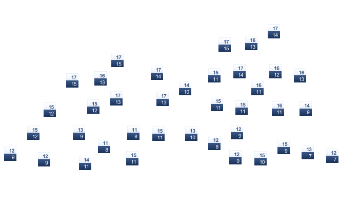 | 21 | 25 | 28 | 32 | 37 | 43 | 45 | 44 | 40 | 33 | 26 | 21 |