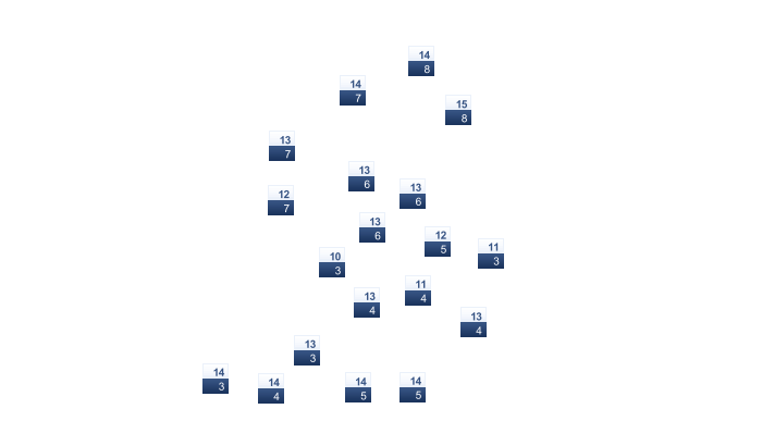 | 4 | 8 | 11 | 15 | 19 | 25 | 27 | 27 | 23 | 17 | 10 | 5 |