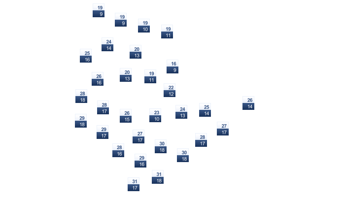 | 21 | 25 | 28 | 32 | 37 | 43 | 45 | 44 | 40 | 33 | 26 | 21 |