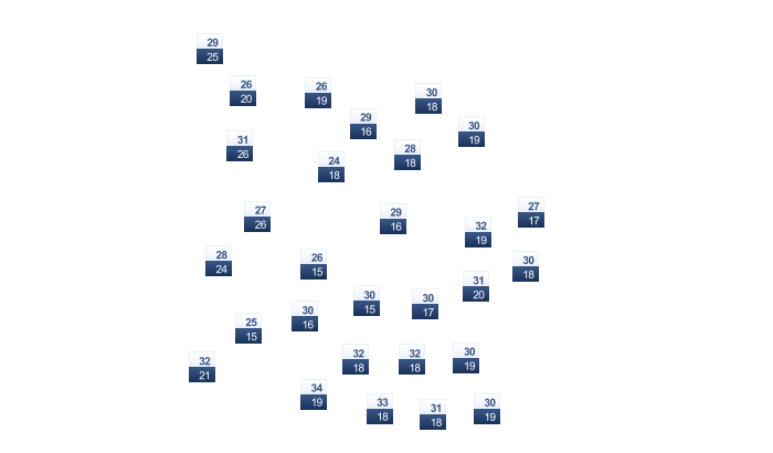 | 30 | 30 | 31 | 30 | 29 | 27 | 25 | 25 | 27 | 28 | 29 | 29 |