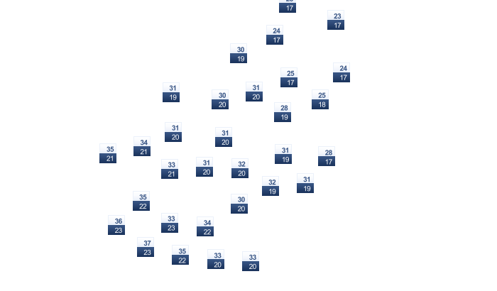 | 30 | 30 | 31 | 30 | 29 | 27 | 25 | 25 | 27 | 28 | 29 | 29 |