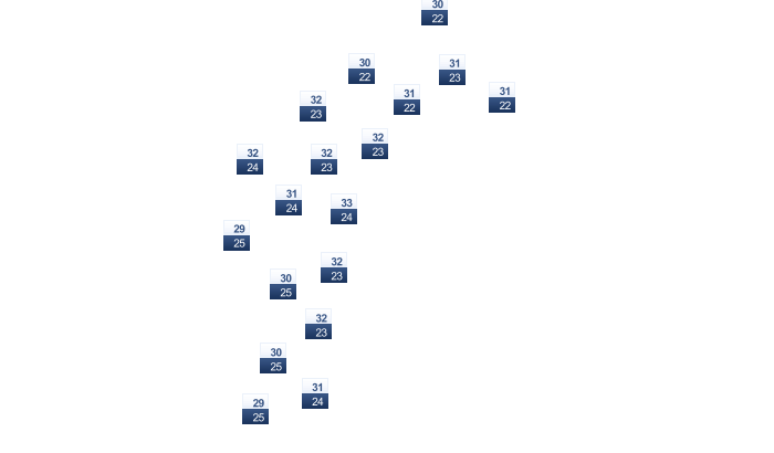 | 30 | 30 | 31 | 30 | 29 | 27 | 25 | 25 | 27 | 28 | 29 | 29 |