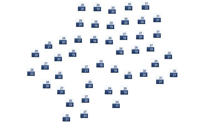 | 30 | 30 | 31 | 30 | 29 | 27 | 25 | 25 | 27 | 28 | 29 | 29 |