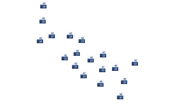 | 31 | 30 | 26 | 22 | 17 | 13 | 13 | 15 | 18 | 22 | 26 | 30 |