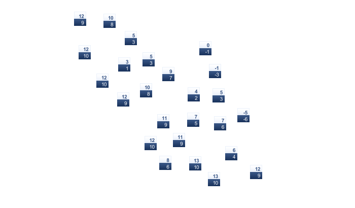 | 7 | 8 | 13 | 17 | 25 | 28 | 31 | 30 | 26 | 19 | 14 | 10 |