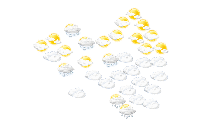 In Almu gibt es am Tag Schnee bei Werten von -2 bis zu -1°C. Nachts ziehen Wolkenfelder durch bei Tiefstwerten von -3°C. Böen können Geschwindigkeiten zwischen 12 und 17 km/h erreichen.