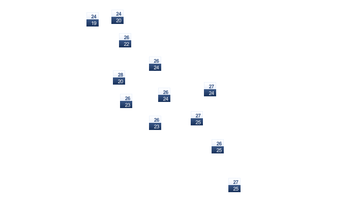 | 25 | 25 | 27 | 28 | 29 | 31 | 32 | 32 | 31 | 30 | 28 | 26 |