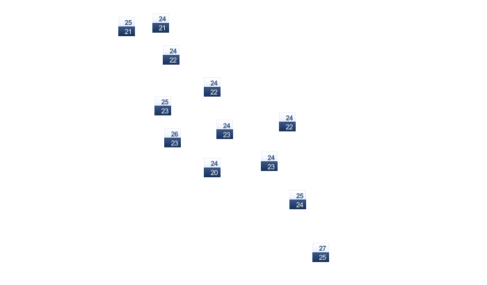 | 25 | 25 | 27 | 28 | 29 | 31 | 32 | 32 | 31 | 30 | 28 | 26 |