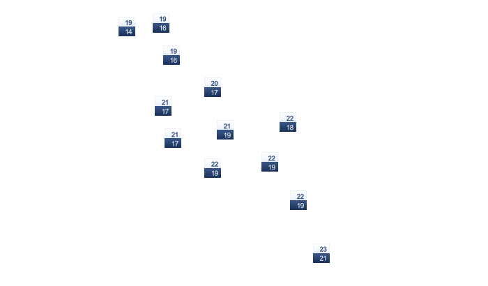 | 17 | 17 | 18 | 19 | 21 | 23 | 24 | 24 | 24 | 22 | 20 | 18 |