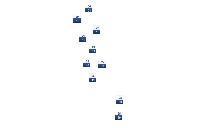 | 20 | 21 | 25 | 29 | 34 | 36 | 38 | 38 | 37 | 33 | 28 | 22 |