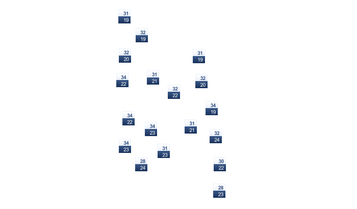 | 24 | 27 | 33 | 35 | 34 | 32 | 32 | 32 | 32 | 31 | 28 | 25 |