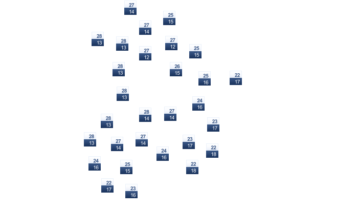 | 11 | 13 | 17 | 22 | 24 | 25 | 26 | 26 | 26 | 23 | 17 | 13 |
