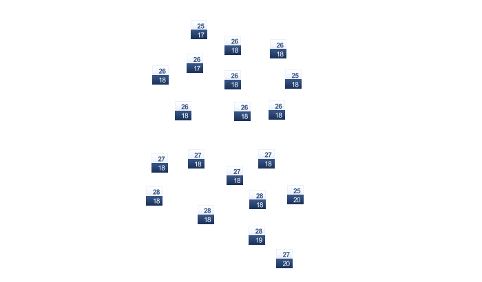 | 11 | 13 | 17 | 22 | 24 | 25 | 26 | 26 | 26 | 23 | 17 | 13 |