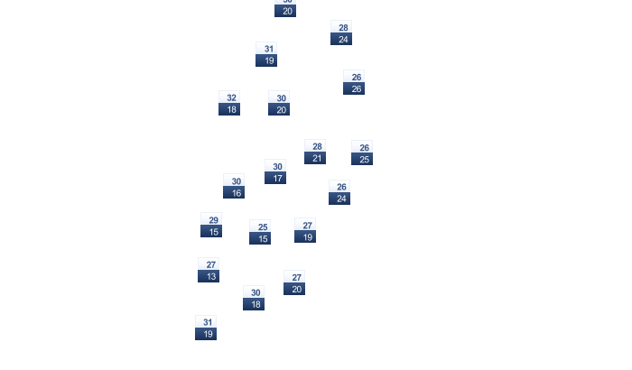 | 28 | 28 | 30 | 31 | 31 | 31 | 31 | 32 | 31 | 30 | 29 | 27 |