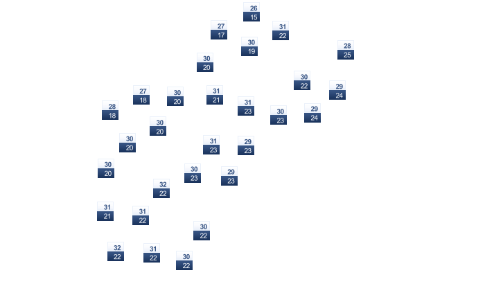 | 28 | 28 | 30 | 31 | 31 | 31 | 31 | 32 | 31 | 30 | 29 | 27 |