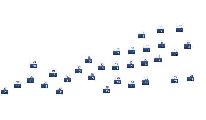 In Nganglam gibt es am Morgen ungestörten Sonnenschein und die Temperatur liegt bei 12°C. Im weiteren Verlauf des Tages ist es vom Nachmittag bis abends locker bewölkt und die Temperaturen liegen zwischen 14 und 25 Grad. Nachts gibt es nur selten Lücken in der Wolkendecke bei Tiefstwerten von 13°C.