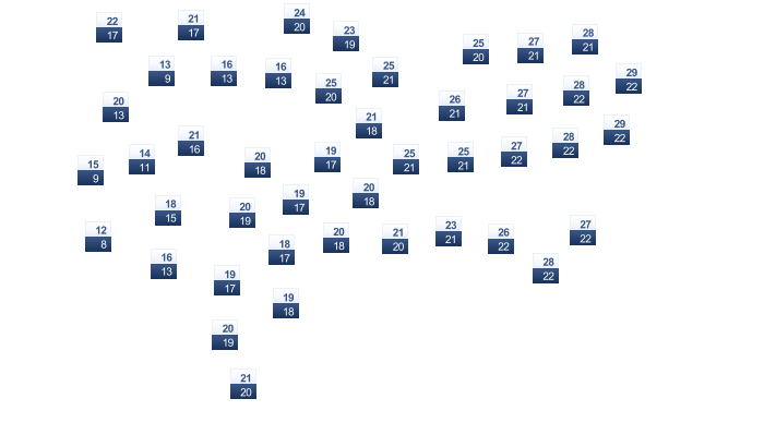 | 25 | 22 | 21 | 21 | 19 | 17 | 16 | 18 | 20 | 21 | 21 | 21 |