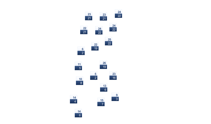 | 25 | 22 | 21 | 21 | 19 | 17 | 16 | 18 | 20 | 21 | 21 | 21 |