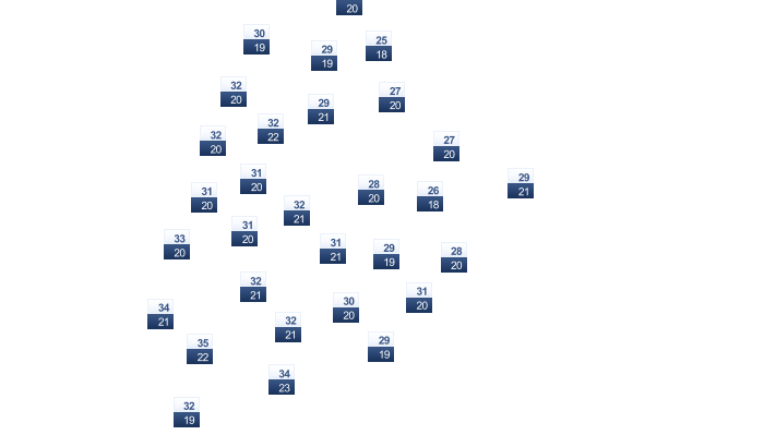 | 31 | 30 | 29 | 29 | 26 | 23 | 24 | 26 | 30 | 32 | 32 | 31 |