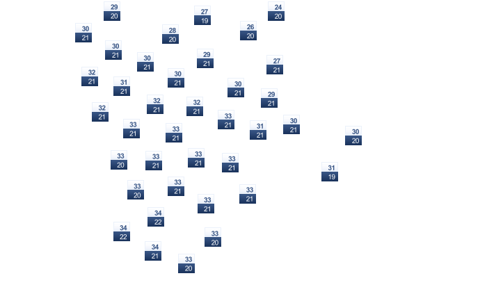 | 31 | 30 | 29 | 29 | 26 | 23 | 24 | 26 | 30 | 32 | 32 | 31 |