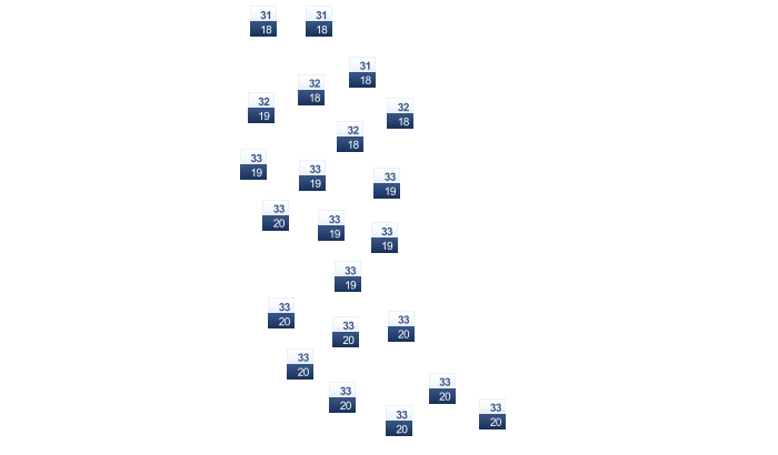 | 31 | 30 | 29 | 29 | 26 | 23 | 24 | 26 | 30 | 32 | 32 | 31 |