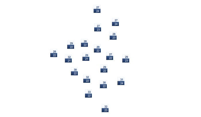 | 23 | 24 | 24 | 23 | 22 | 22 | 21 | 21 | 22 | 22 | 23 | 23 |