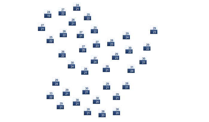 | 30 | 30 | 30 | 29 | 28 | 27 | 27 | 27 | 27 | 28 | 29 | 29 |