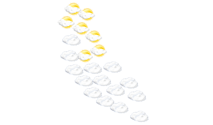 In Cámeron ist morgens der Himmel bedeckt, die Sonne ist nicht zu sehen bei Werten von 7°C. Des Weiteren kommt es mittags und auch abends zu einem Mix aus Sonne und Wolken bei Temperaturen von 10 bis 12°C. In der Nacht ziehen Wolkenfelder durch bei Werten von 8°C.