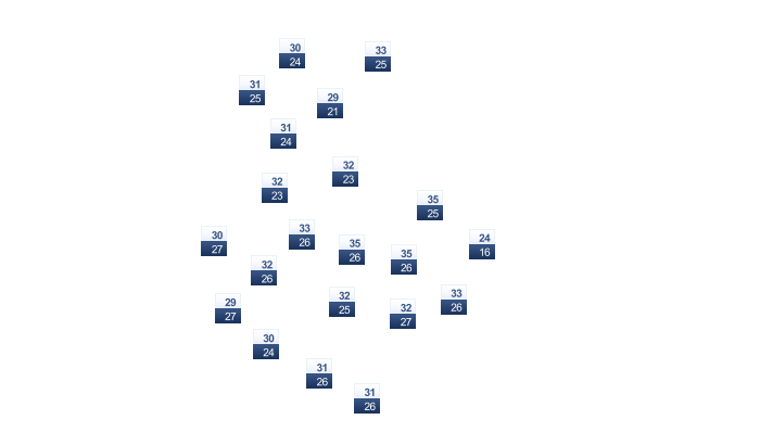 | Temperatur Höchstwerte °C | 30 | 30 | 30 | 31 | 31 | 31 | 30 | 30 | 30 | 31 | 30 | 30 |