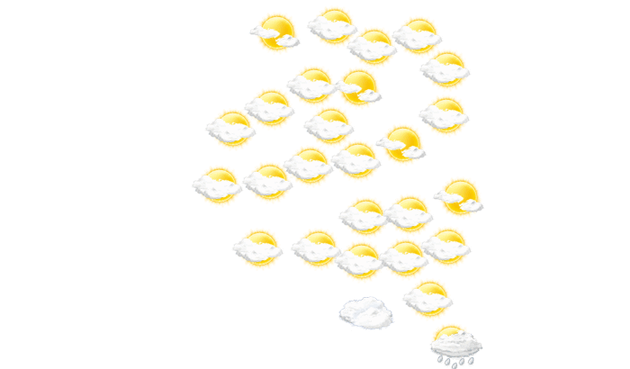 In Mweka wechseln sich den ganzen Tag Wolken und Sonne ab und die Temperaturen liegen zwischen 19 und 28°C. Nachts ziehen Wolkenfelder durch bei Tiefstwerten von 20°C.