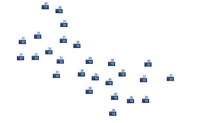 | 28 | 28 | 28 | 29 | 30 | 30 | 31 | 31 | 31 | 31 | 29 | 28 |