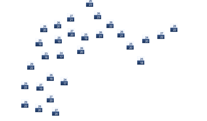 | 28 | 28 | 28 | 29 | 30 | 30 | 31 | 31 | 31 | 31 | 29 | 28 |