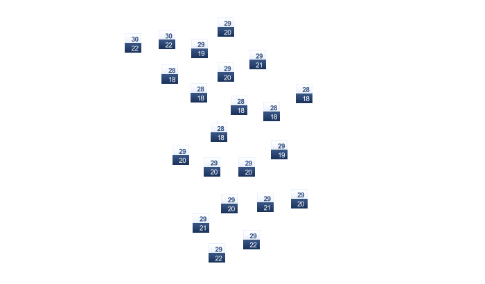 | 28 | 28 | 28 | 29 | 30 | 30 | 31 | 31 | 31 | 31 | 29 | 28 |