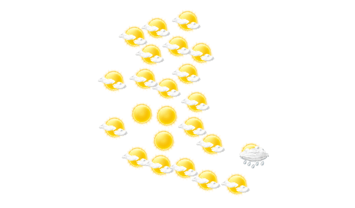 In El Factor stören morgens nur einzelne Wolken den sonst blauen Himmel bei Werten von 21°C. Im Laufe des Mittags ist es vielfach wolkig, gebietsweise kann sich auch die Sonne durchsetzen bei Höchsttemperaturen bis zu 27°C. Am Abend ist es in El Factor wolkenlos bei Temperaturen von 23 bis 24°C. Nachts ist es wolkenlos bei einer Temperatur von 21°C.