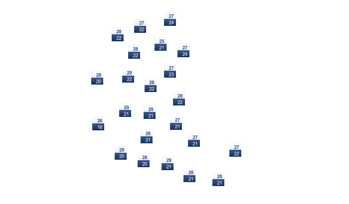 | 28 | 28 | 28 | 29 | 30 | 30 | 31 | 31 | 31 | 31 | 29 | 28 |