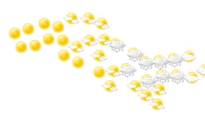 In Monte Llano ist es am Morgen bewölkt, die Sonne zeigt sich nur vereinzelt bei Werten von 21°C. Im weiteren Tagesverlauf bleibt der Himmel vom Nachmittag bis abends grau und es regnet bei Werten von 23 bis zu 28°C. Nachts fällt Regen bei einer Temperatur von 21°C.