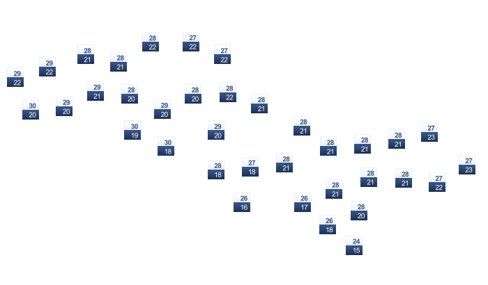 | 28 | 28 | 28 | 29 | 30 | 30 | 31 | 31 | 31 | 31 | 29 | 28 |